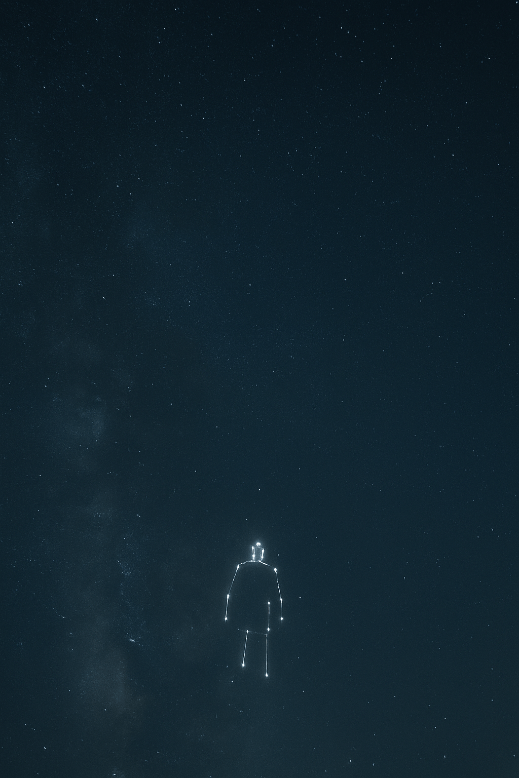 A lone silhouetted figure runs along a distant mountain ridge beneath a vast twilight sky of deep blue and violet. Golden light breaks at the horizon, symbolising heaven and earth meeting in the reign of God. The atmosphere is quiet, cosmic, and filled with hope.